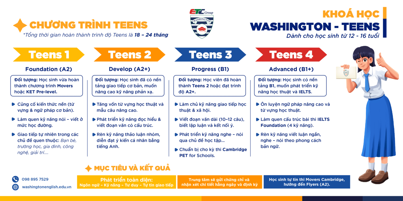 Khóa học Tiếng Anh Washington Teens dành cho học sinh từ 12 – 16 tuổi. Chương trình gồm 4 cấp độ: Teens 1 – Foundation (A2), Teens 2 – Develop (A2+), Teens 3 – Progress (B1), Teens 4 – Advanced (B1+)