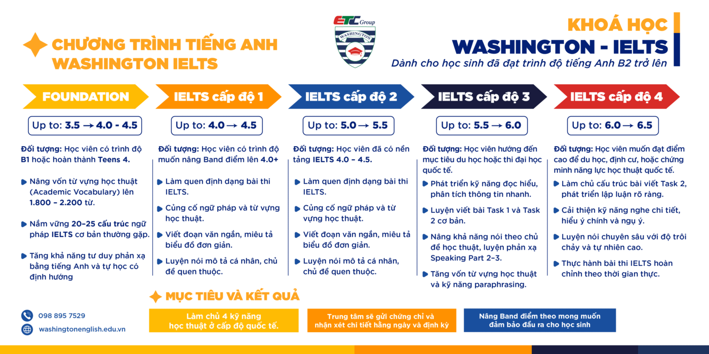 Chương trình Tiếng Anh Washington IELTS dành cho học sinh đã học xong trình độ tiếng anh B2 và thi kết quả đầu vào thấp nhất đạt Ielts 3.5.